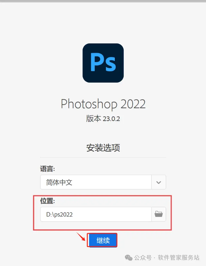 第四步:在D盘建一个名为PS2022的文件位,安装时选择此文件夹,并点继续。
