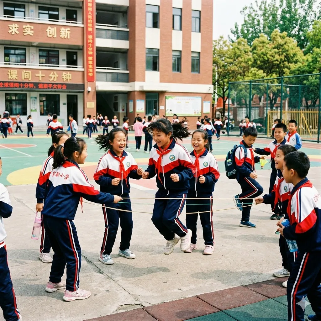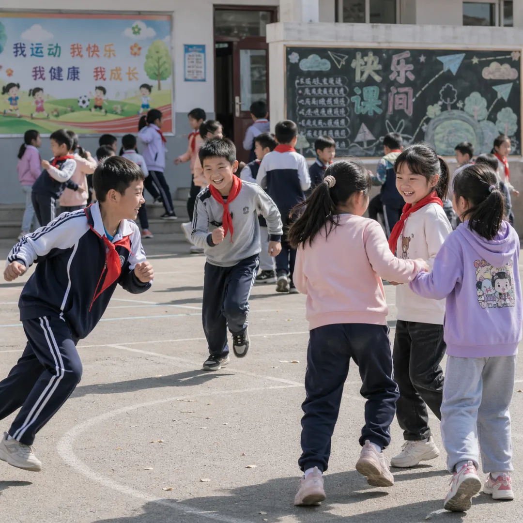 帮我生成一张00后小学生课间下课玩耍场景,Make the aspect ratio 1:1