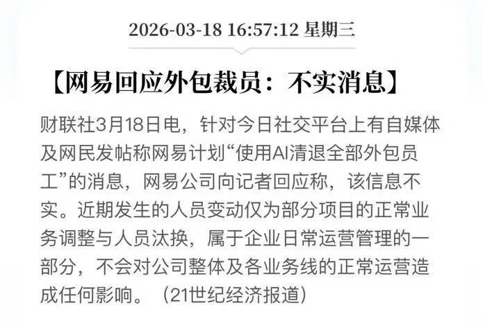 2026年3月,传闻称网易互娱计划在4月削减三四成外包人员,5月直接清零,原因是内部AI已经能覆盖这些岗位的工作。