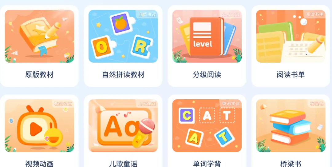 2、APP海量的原版教材、分级绘本、儿歌动画等资源、教材的点读,跟读测评,查词,习题单词练习。