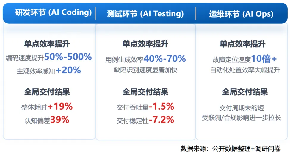 核心洞察:局部效率增益被系统性瓶颈抵消:单点智能化仅解决执行效率问题,却放大了需求协同、架构约束、代码审核、安全合规等系统性瓶颈。这导致局部效率提升无法转化为整体交付速率的增长,甚至在规模化实践中出现”交付速率不增反降”的现象,单点智能≠全局增益。
