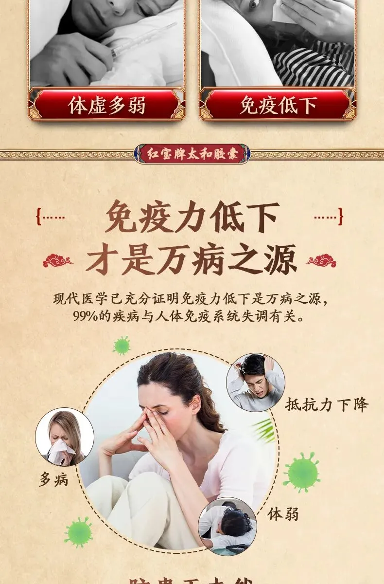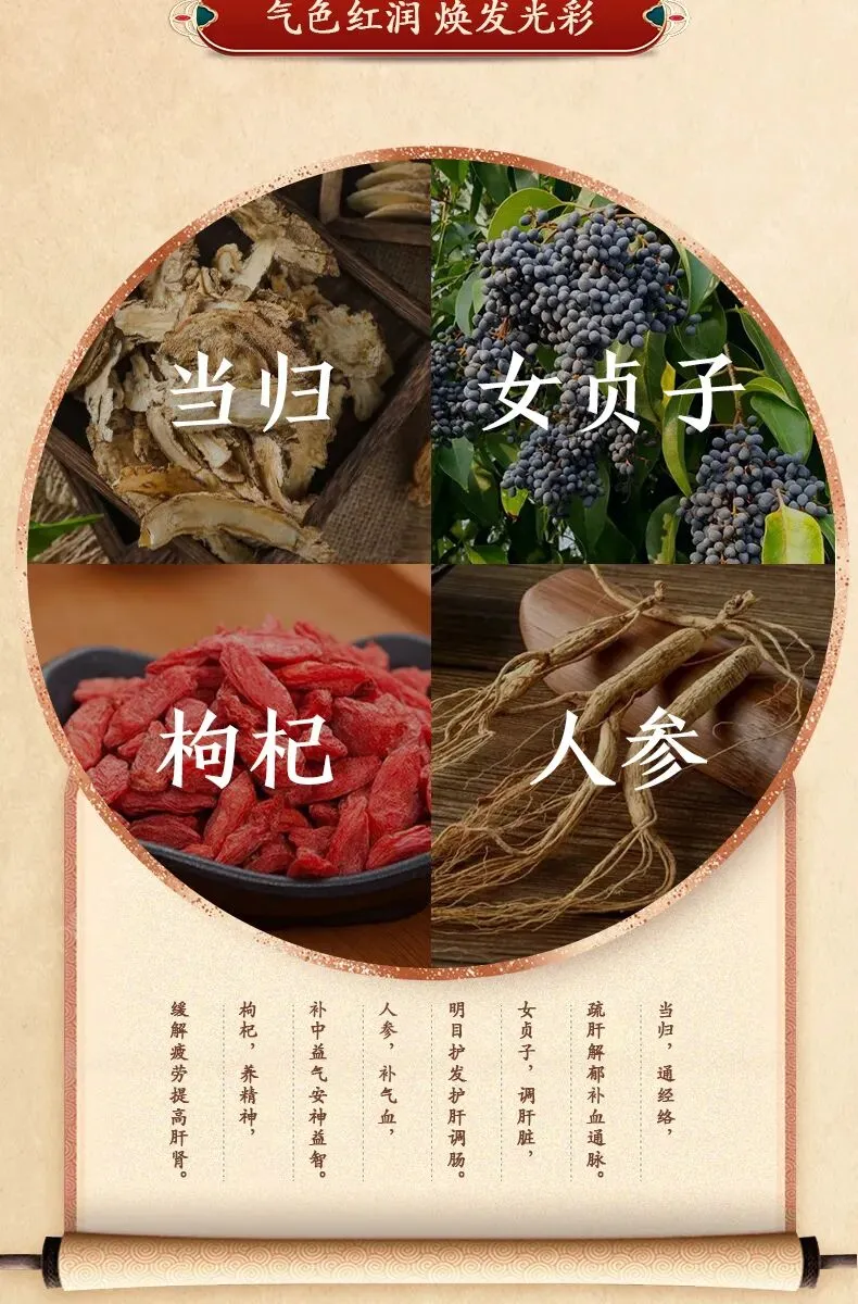 精选人参、当归、枸杞、女贞子四味名贵中草药,采用现代化先进萃取技术,最大限度提取活性成分。可以气血双补,双向调节免疫。