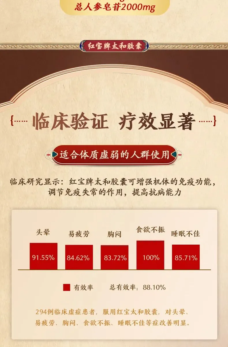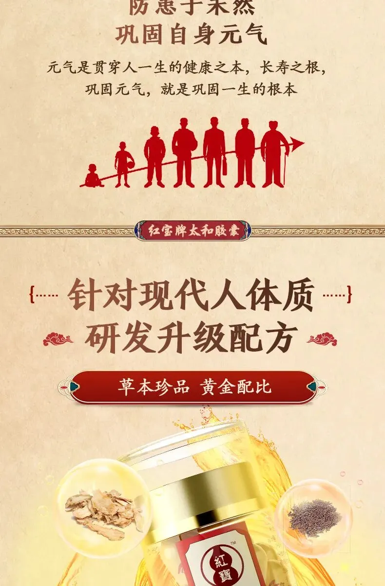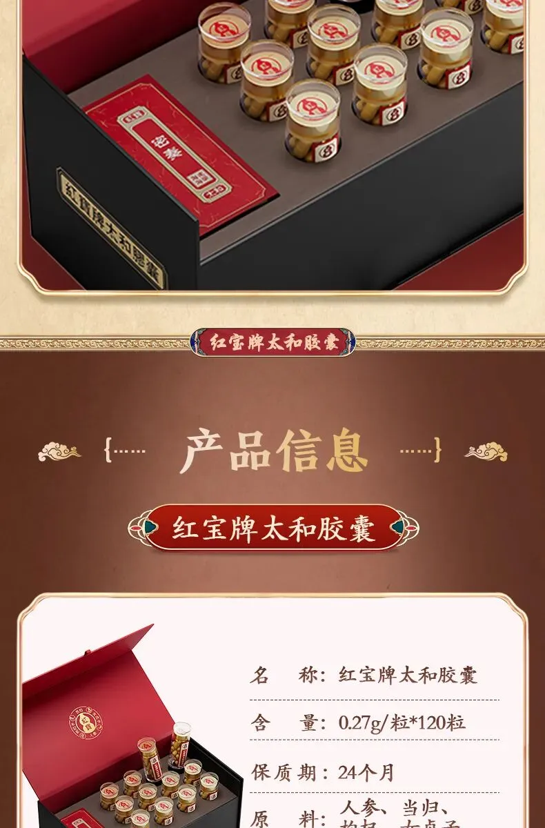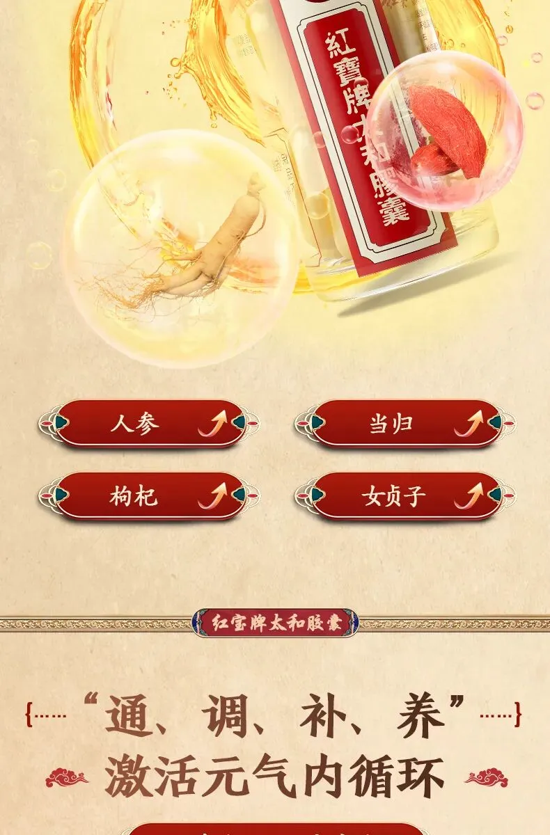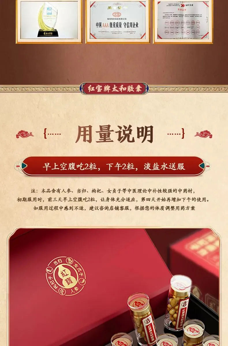 红宝太和胶囊,由央企新兴际华集团旗下海南海药出品,与中国人民解放军军事医学科学院共同研制,配方取自宋代医学著作《太平圣惠方》。