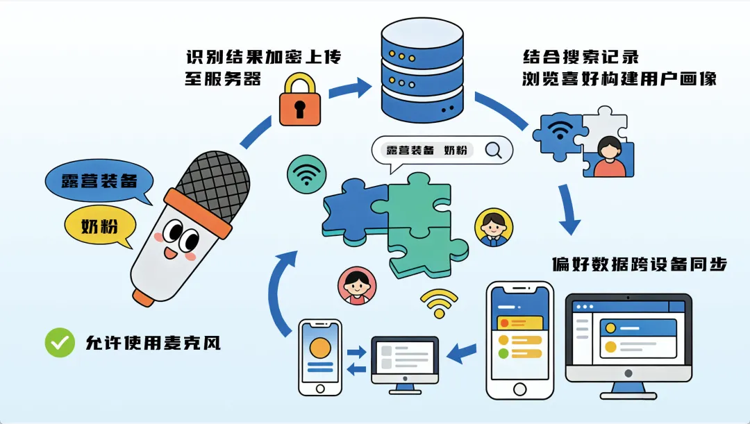 “本地关键词触发”是什么意思? 简单来说,当你允许App使用麦克风后,你的手机并不会把你说的话全部录下来上传,而是在本地识别环境声音中的关键词——比如“拉布布”“露营装备”等,然后将识别结果加密上传至服务器。
