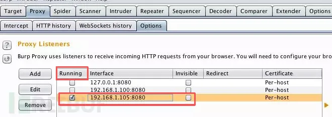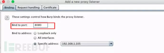 打开Burp Suite,点击Proxy → Options选项卡。点击Add添加一个新的代理监听器,在Bind to port中填写端口(比如8080),Bind to address选择“Specific address”,然后选你电脑的IP地址。