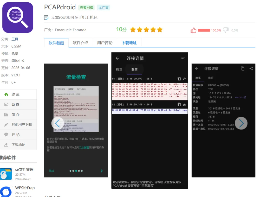 PCAPdroid:无需root就能监控手机上所有App的网络活动,能实时查看每个应用的连接IP、传输数据量,还可以标记异常请求。安装后开启抓包,正常使用App几分钟,然后保存抓包文件导出到电脑,用Wireshark打开分析。PCAPdroid利用Android的VPNService API来捕获数据包,完全不需要root权限。
