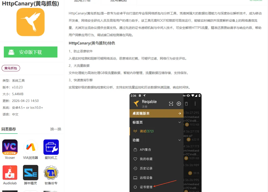 HttpCanary(小黄鸟):也是一款免root的手机抓包工具,界面更直观,但部分新手机可能需要安装CA证书才能抓HTTPS。支持实时查看请求和响应内容,对新手更友好。