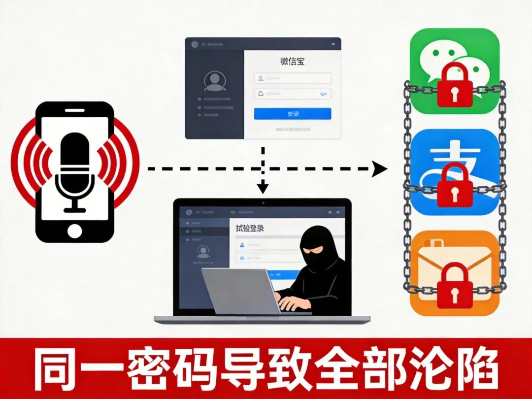 黑客通过监听你输入的语音,获取你的账号信息,然后用这些信息去尝试登录你的微信、支付宝、邮箱。如果你所有账号都用同一个密码,那他就把所有账号都拿下了。