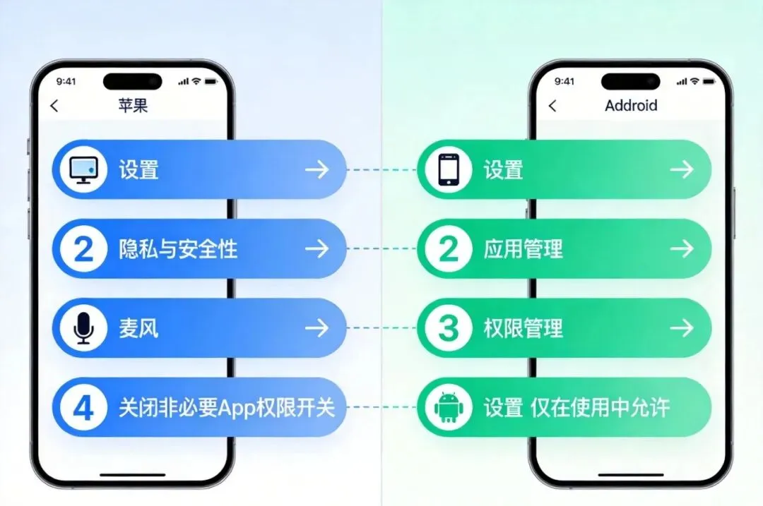 苹果:设置 → 隐私与安全性 → 麦克风 → 逐一检查,只保留微信、通话等必需App的权限,其余一律关闭。