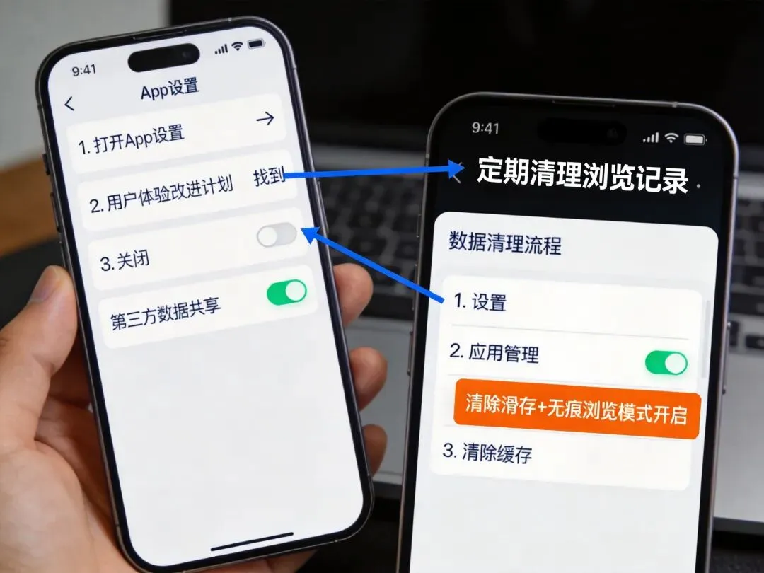 定期清除App缓存和浏览记录,浏览敏感内容时使用无痕模式。