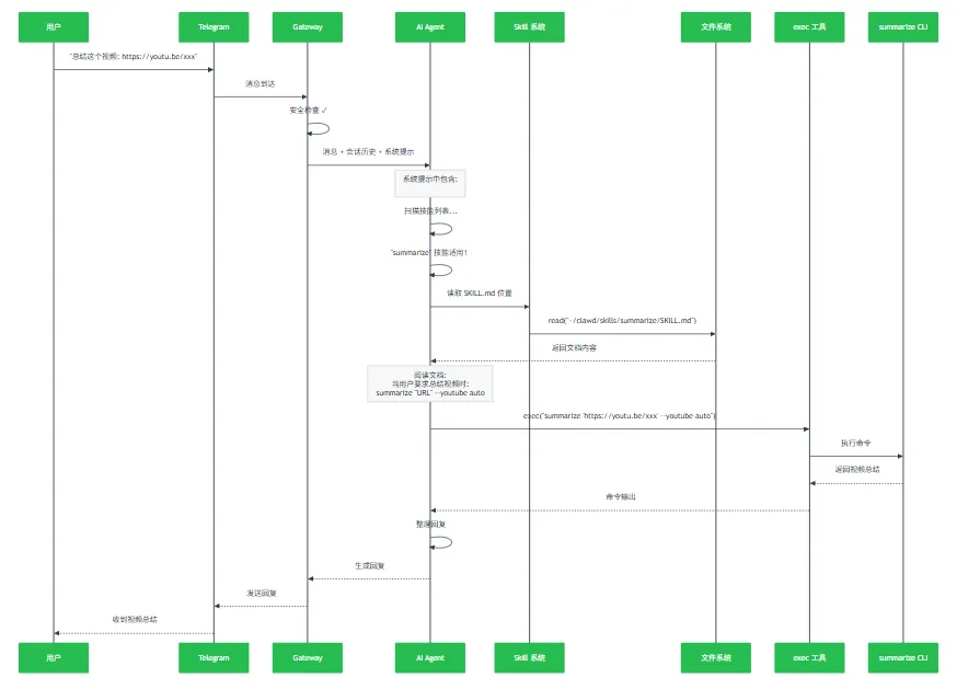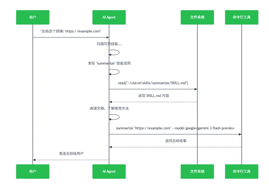 用户消息: "帮我总结一下这个链接 https://example.com/article"AI 思考过程:1. 扫描 <available_skills> 列表2. 发现 "summarize" 技能的描述: "Summarize or extract text from URLs..."3. 判断: 这个技能完全适用!4. 决定: 使用 read 工具读取 SKILL.md 文件5. 执行: 按照 SKILL.md 中的指引操作步骤 3:AI 读取并遵循 Skill 指引