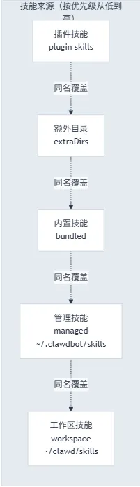 ### 3. Skill 加载机制```mermaidgraph TB A[Gateway 启动] --> B[扫描技能目录] B --> C[按优先级加载] C --> D[extraDirs<br/>额外目录<br/>最低优先级] C --> E[bundledSkills<br/>内置技能] C --> F[managedSkills<br/>管理技能<br/>~/.clawdbot/skills] C --> G[workspaceSkills<br/>工作区技能<br/>最高优先级] G --> H[解析 SKILL.md] H --> I[提取 Frontmatter 元数据] I --> J[检查依赖条件] J --> K{符合条件?} K -->|是| L[加入技能列表] K -->|否| M[跳过] L --> N[格式化后注入系统提示] style G fill:#ff6b6b style N fill:#4ecdc44. Skill 如何被 AI 发现和使用?