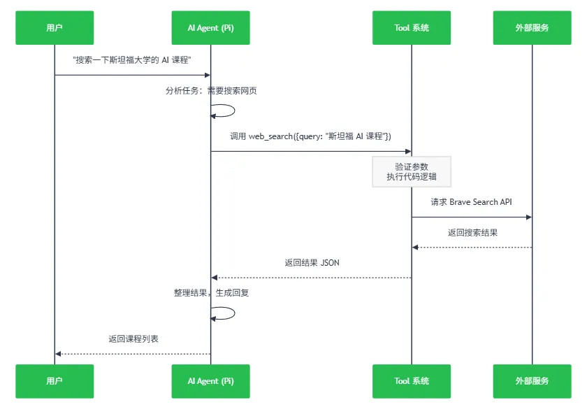 AI 的 Tool 调用是由 Pi Agent 运行时处理的: