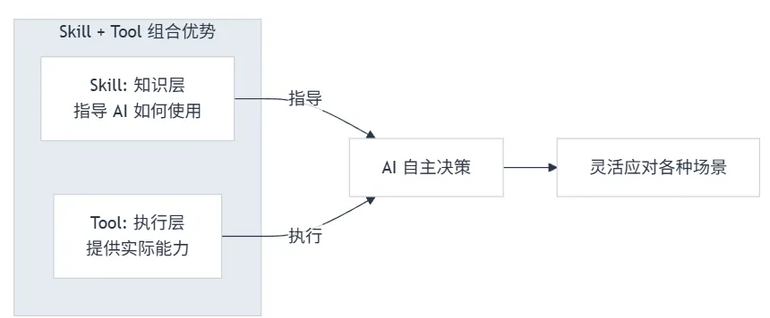 :Tool 提供基础能力,Skill 提供使用策略 - AI 自主性