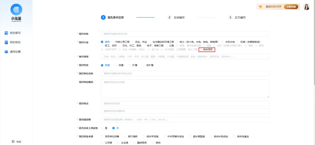 电脑登录进入官网→ 「AI智写」选择「可研报告」→ 填写项目名称、行业(综合项目适用于多行业交叉项目)、建设期、资金来源等基础信息。