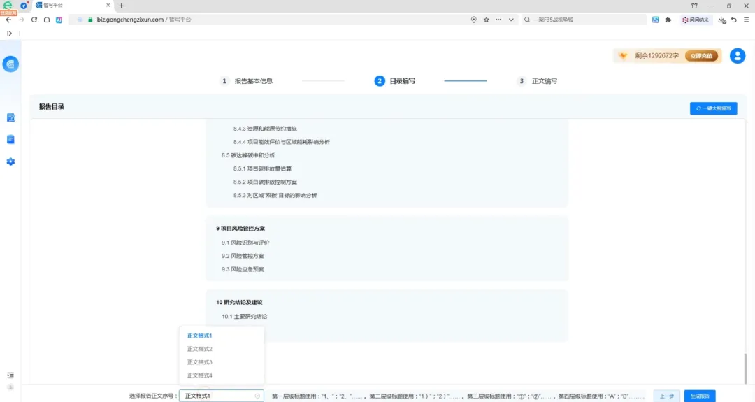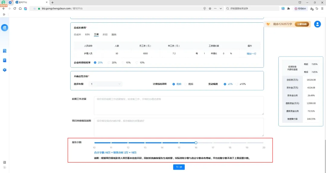 填写完成后,设置报告字数(10–20万字)→点击下一步。