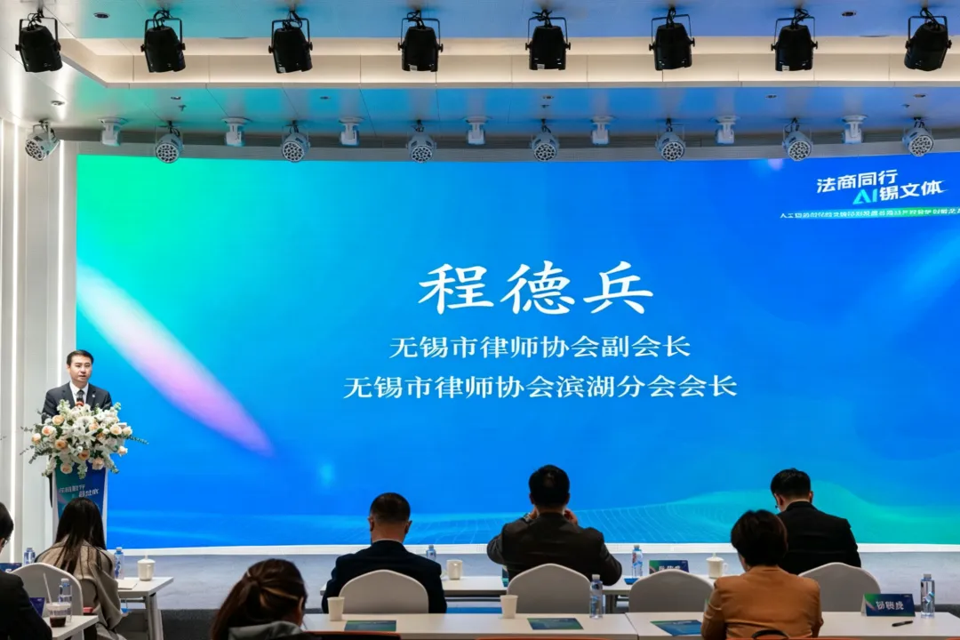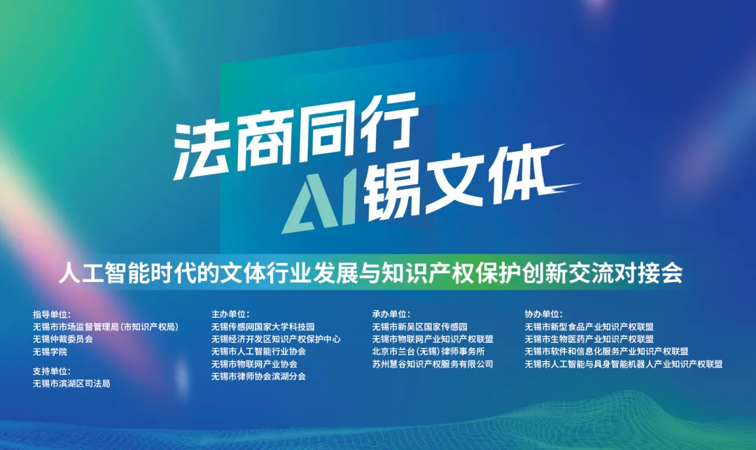 2026年4月22日,由无锡市律师协会滨湖分会、无锡传感网国家大学科技园、无锡经济开发区知识产权保护中心、无锡市人工智能行业协会、无锡市物联网产业协会共同主办,北京市兰台(无锡)律师事务所(以下简称“兰台无锡”)、无锡市新吴区国家传感园、无锡市物联网产业知识产权联盟、苏州慧谷知识产权服务有限公司共同承办的法商同行·AI锡文体—— 人工智能时代的文体行业发展与知识产权保护创新交流对接会圆满举办,感谢无锡市市场监督管理局(市知识产权局)、无锡仲裁委员会、太湖学院的指导,感谢无锡市滨湖区司法局及相关协办单位的大力支持。