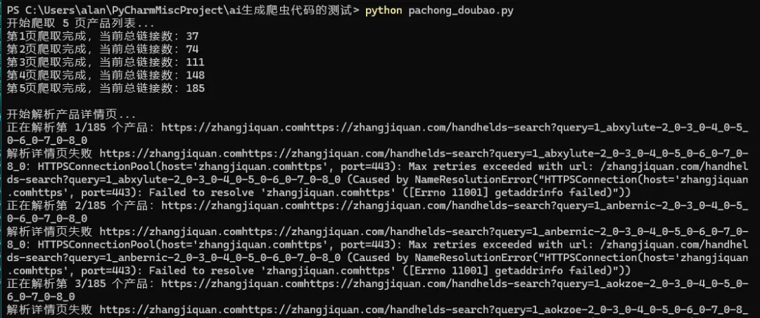 豆包:爬取列表页时得到的结果数错误,应该是一页20条,而她爬到37条,多出的17条应该是头部查询条件链接,并且接下来的每页都是37条,最终就成了185条链接,由于错误链接不是详情页,所以到解析会报错,但不影响后续正确链接的解析