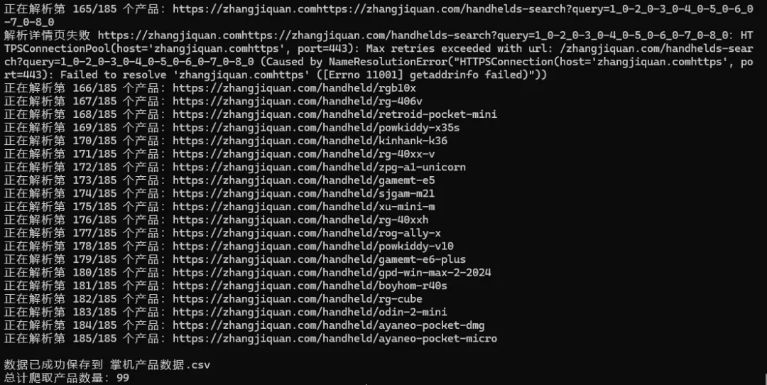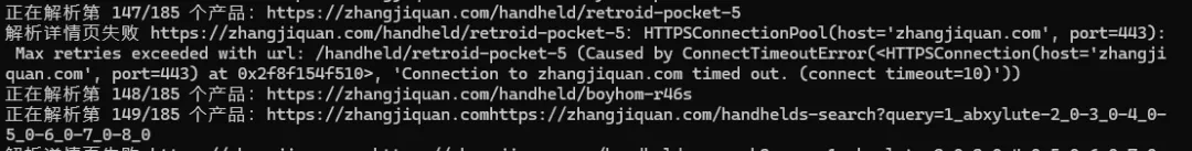 日志发现一条失败日志:解析详情页失败https://zhangjiquan.com/handheld/retroid-pocket-5:HTTPSConnectionPool(host=’zhangjiquan.com’, port=443): Max retries exceeded with url: /handheld/retroid-pocket-5 (Caused by ConnectTimeoutError(<HTTPSConnection(host=’zhangjiquan.com’, port=443) at 0x2f8f154f510>, ‘Connection to zhangjiquan.com timed out. (connect timeout=10)’))最终导致整理数据少一条。