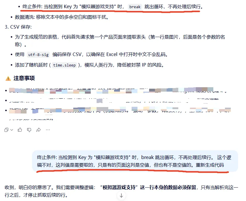csv表格检查:详情页数据准确,第一列图片链接正确,可打开。唯独缺少最后一列模拟器游戏支持列,看了代码虽然理解有误,但注释很清晰,很容易的重新提交了修改要求,再次生成代码,重新爬取得到正确可用的表格。扣5分。