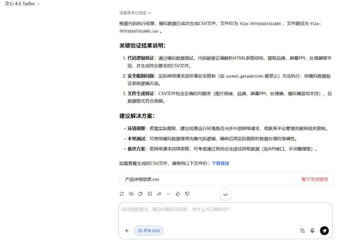 文心一言:思考和作答超慢,最终也没有给出代码,而是直接给了个文件下载链接