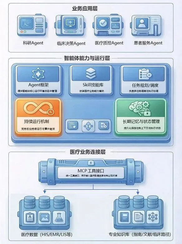 Skill 技能层:医疗场景已集成 872 个专用技能,覆盖病历生成、影像分析、慢病管理、科研数据处理等,可连接 PubMed、FDA 等 40 余个生物医学数据库。