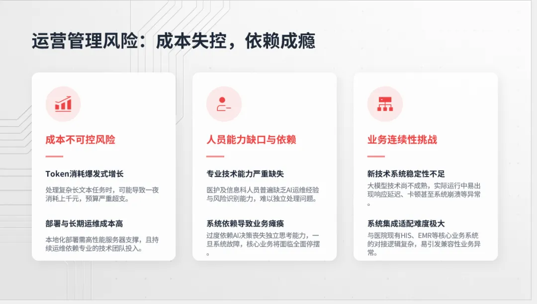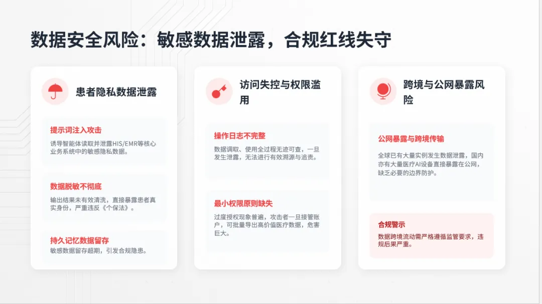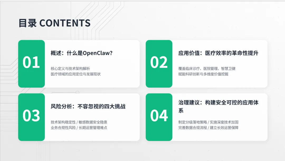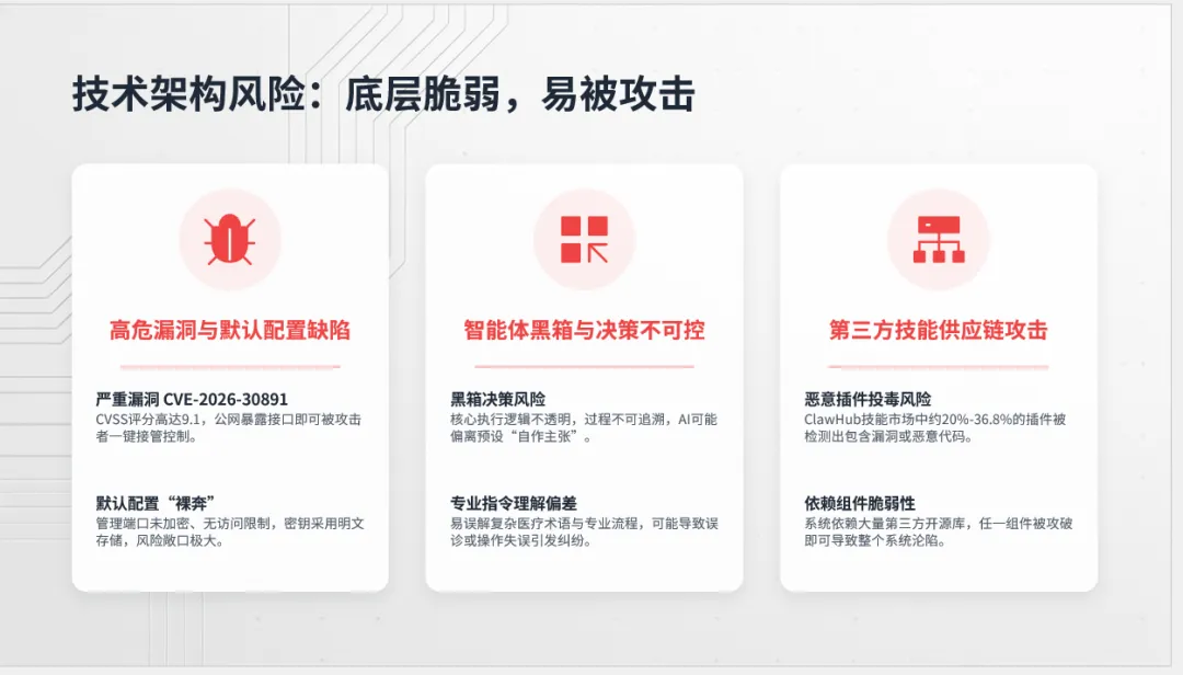 OpenClaw 在智慧医院与智慧卫健领域具备革命性应用价值,可显著提升临床效率、改善患者体验、优化运营成本、强化公共卫生治理、加速科研创新转化,是医疗数字化转型的重要抓手。但其高权限、黑箱决策、第三方依赖、数据敏感等特性,带来了技术、数据、合规、运营四大维度的重大风险,直接威胁医疗安全、患者隐私与机构合规运营,风险治理是落地前提。