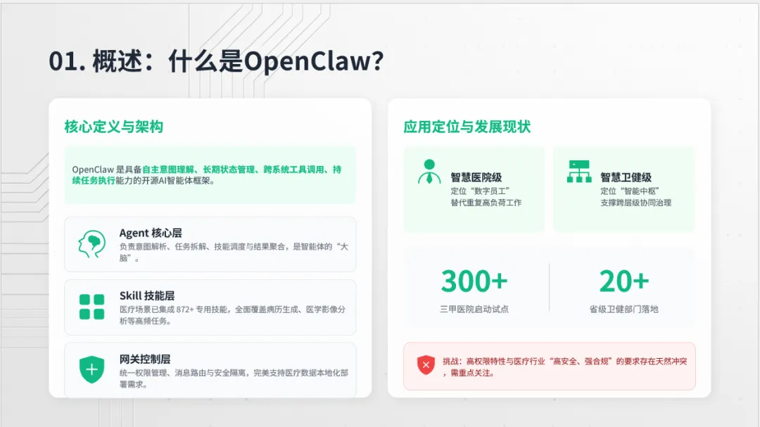 OpenClaw(龙虾)作为高权限开源 AI 智能体,正从通用工具快速渗透至智慧医院与智慧卫健领域,形成 “智能体 + 医疗技能库” 的新型应用范式。本报告聚焦其在临床诊疗、医院管理、公共卫生、科研创新四大场景的核心价值,深入剖析技术架构、数据安全、业务合规、运营管理四大维度的关键风险,并提出分级落地、技术加固、制度保障、合规审计的系统化治理框架,为医疗机构、卫健部门及产业方提供决策参考。