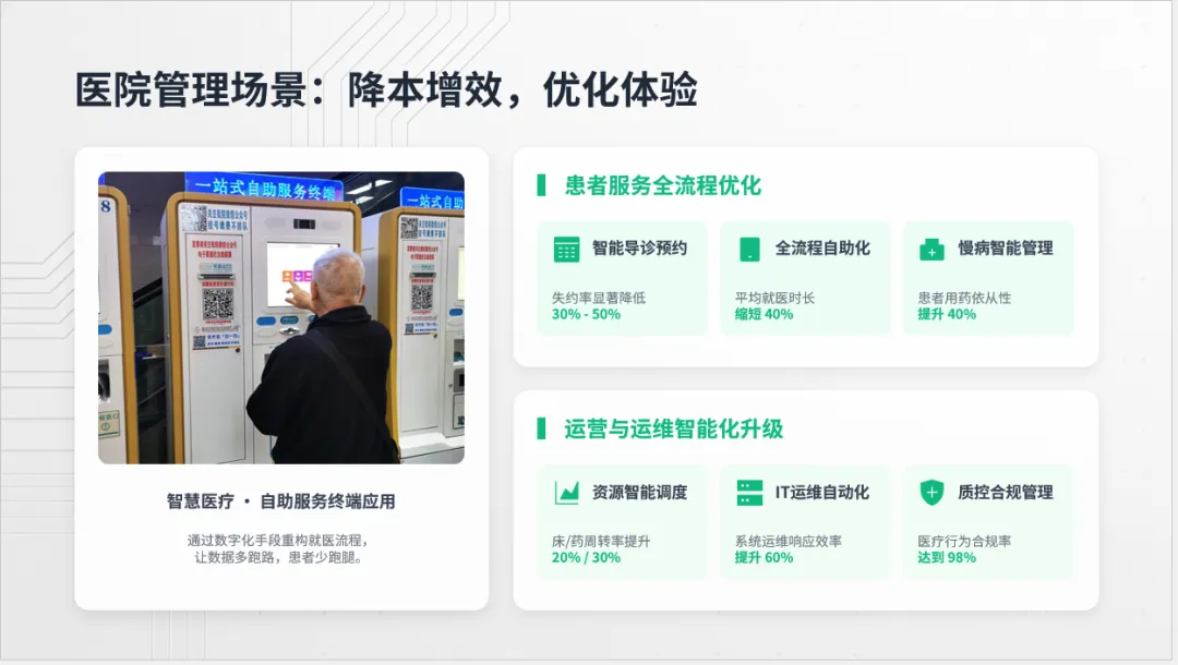 智慧医院级:聚焦院内核心业务,覆盖临床辅助、患者服务、运营管理、运维保障,定位为 “数字员工”,替代重复性、高负荷、标准化工作。