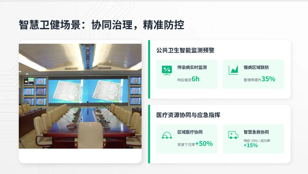 智慧卫健级:面向区域卫健体系,覆盖公共卫生监测、慢病联防联控、医疗资源协同、应急指挥调度,定位为 “智能中枢”,支撑跨机构、跨层级、跨区域协同治理。解读时间从数天缩短至数小时。