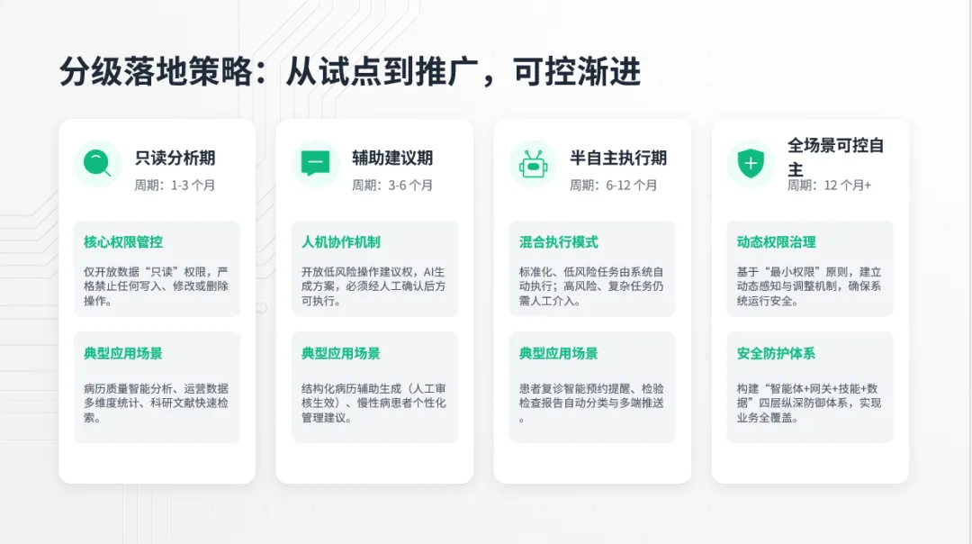 医疗机构与卫健部门应坚持 “安全可控、合规先行、价值导向、渐进落地” 原则,构建 “分级落地、技术加固、数据合规、制度保障、能力建设” 的系统化治理框架,分阶段、分场景、分权限稳妥推进 OpenClaw 应用,优先保障医疗安全与数据合规,逐步释放技术价值。
