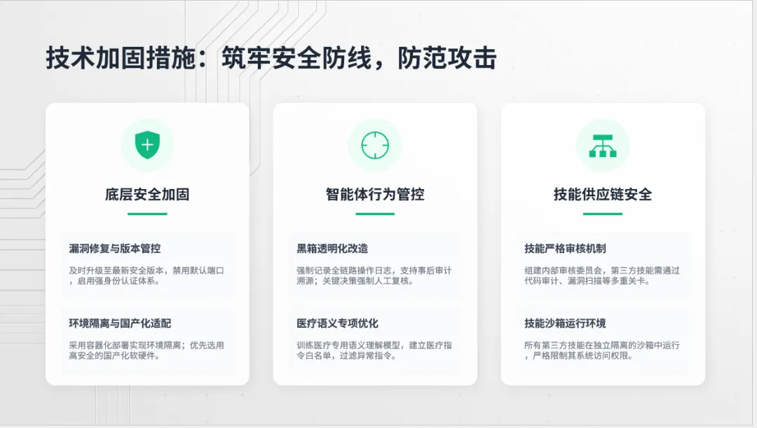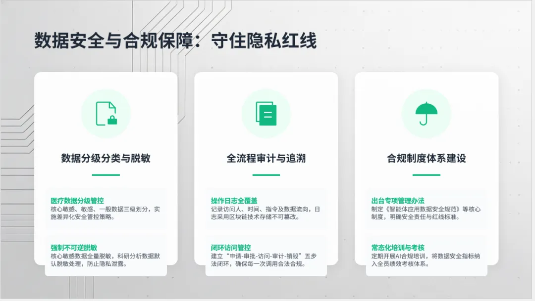 网关控制层:统一权限管理、消息路由与安全隔离,支持本地化部署,核心数据不出院,适配国产化芯片与自主云平台。