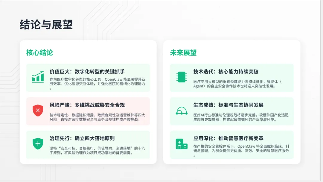 未来,随着医疗专用大模型迭代、智能体安全技术突破、行业标准规范完善、国产化生态成熟,OpenClaw 有望在严格管控下实现更广泛、更深入、更安全的应用,推动智慧医院与智慧卫健建设进入新阶段,为人民群众提供更优质、高效、便捷、安全的医疗健康服务。
