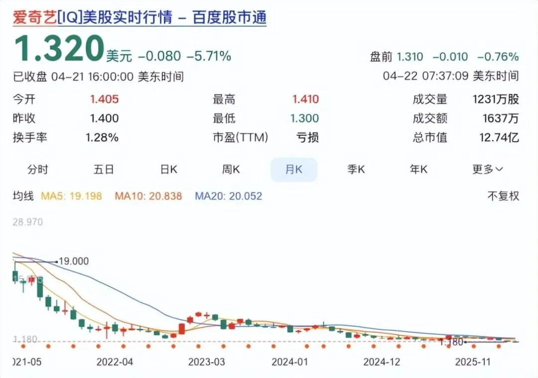 截至2026年4月21日,爱奇艺收盘价1.32美元。相比2021年高点约46美元,跌幅超过95%。市值从312亿美元跌到12亿,蒸发掉了2000多亿人民币。同期B站市值是它的10倍,连搜狐都有8美元,爱奇艺却跌成了一只”仙股”。