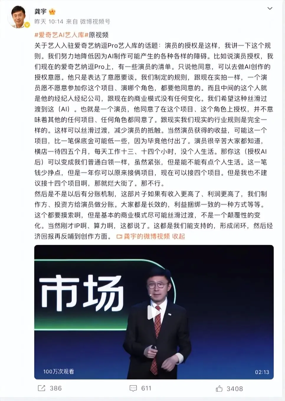 龚宇在4月20日的发言中,最翻车的一句话不是”AI艺人库”,而是那句”让演员像普通白领一样生活”。