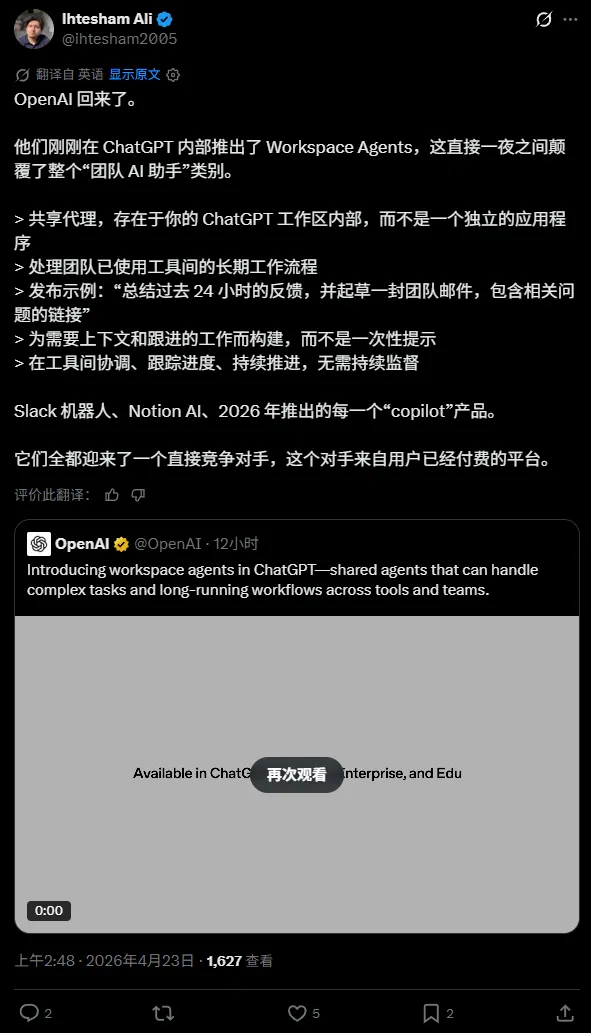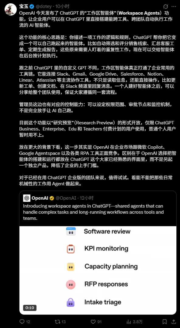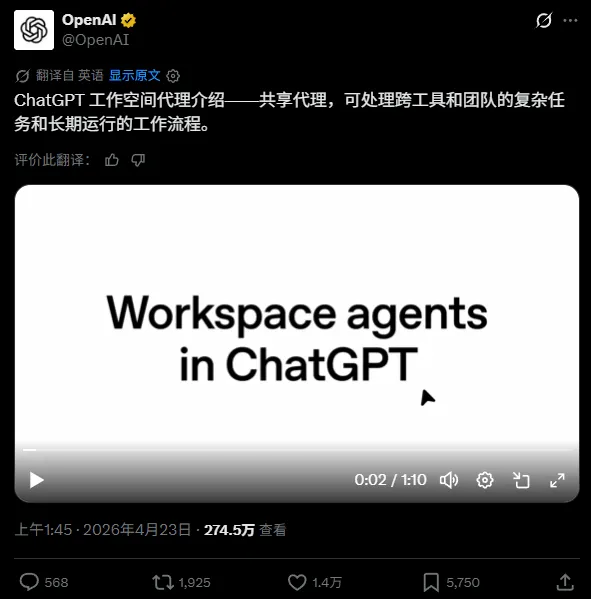 4月22日,OpenAI官方账号发布帖子,宣布推出一项名为Workspace Agents in ChatGPT的功能,宣称“can handle complex tasks and long-running workflows across tools and teams.(能够处理跨工具和团队的复杂任务及长期运行的工作流程)”。