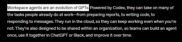 并且,在这篇博客中,官方文档还标注道,“GPTs will remain available while teams test workspace agents with their workflows. Soon, we’ll make it easy to convert GPTs into workspace agents.(在团队使用其工作流程测试工作空间智能体期间,GPTs将保持可用。不久之后,我们将简化将GPTs转换为工作空间智能体的过程)”。