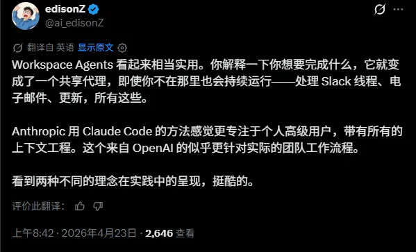 也有使用者对比了Workspace Agents和Claude Code,并提到,前者能直接把你说的话变成一个共享智能体,而后者则更专注于个人用户。OpenAI的这个更针对团队使用场景。