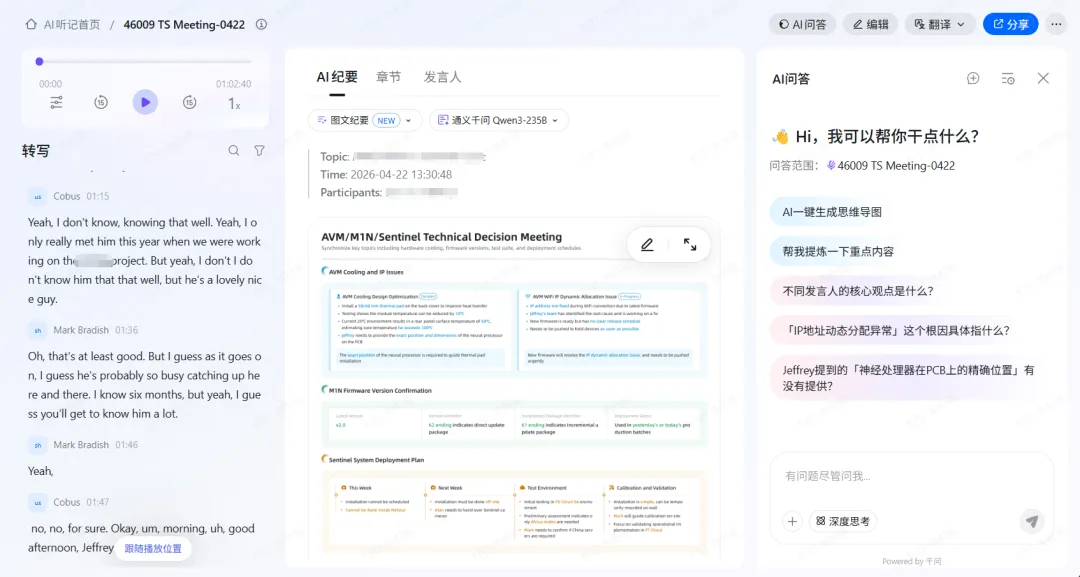 从2022年开始合作到现在的这几年里,定期的技术产品会议一直是惯例。以前在开会的过程中,我都是手写笔记,外加电子笔记工具记录会议内容。即使这样,有时候还会有一些细节遗漏。记得有一次,客户开会的时候问我某某事情的进展,直到这个时候我才想起还有这么一件事儿。从上次会议到现在一周已经过去了,我却把这件事遗忘了。于是,会后继续跟进,但是这大大降低了会议的效率。