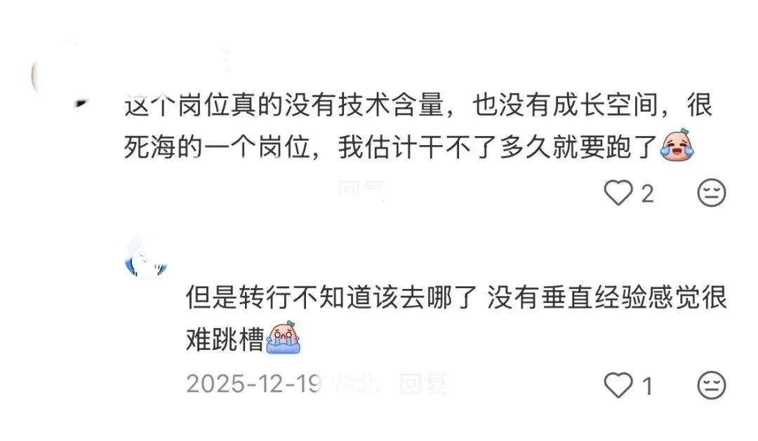 大量的负面信息:加班文化严重,工资低,压力大,钱少事多,xxx岗位不好转行,xxx岗位天花板低,先入行再转行,诸如此类。对于大部分即将踏出校园的应届生来说,这些信息无异于加速了对未来的恐惧。感觉怎么抉择都是在泰坦尼克上选座位,毕竟大部分人都是“三无产品”“无资源,无背景,无人脉”诚然,大环境不好人尽皆知,但是在这类充斥贩卖焦虑,恐惧社交软件上,我们应该保留一点理性思维。工作不可能是十全十美的,选择了A,就要忍受 A 带来的负面影响。真正过的好的人往往不会在社交软件上过多炫耀自己的处境,我们在进行职业选择上,尽可能参考一些已就业的前人的意见,再结合自己,家人,朋友的看法权衡利弊。毕竟除了体制内,很难有人会在同一家公司同一个岗位干一辈子……怎么选都会有这样那样的遗憾。未来会怎么样,我们谁也不知道,唯一能做的是告诉自己不要患得患失,培养一些兴趣爱好,尽可能为可能到来的跳槽,裁员增加一些选择筹码。这里想起来徐涛老师的话:走好自己的选择的路,不合适就及时撤退,每个人的人生都是无法复制的,如果太累太迷茫,给自己点时间休息一下,重新出发,人生这场考试里没有标准答案,也不用与别人赛跑,唯一衡量的标准,就是在这有限的时间里面,我们是否活成了自己想要的标准。最后一段话送给大家,希望所有人都能少点焦虑,多点快乐!☺️