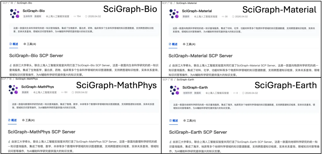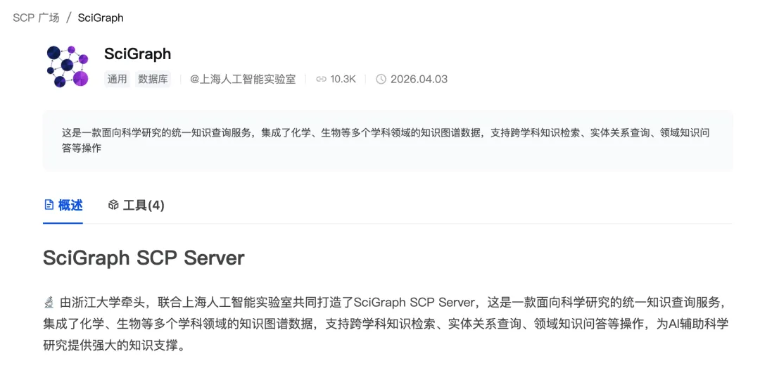 作为 AI 原生开放科学图谱服务的核心载体,SciGraph-SCP Server 依托上海人工智能实验室推出的 SCP (Science Context Protocol),对多学科图谱资源进行协议级统一封装,向上层 AI 智能体提供标准化的知识访问与调用接口,使科学知识能够以可计算、可溯源、可编排的形态被智能体原生调用。