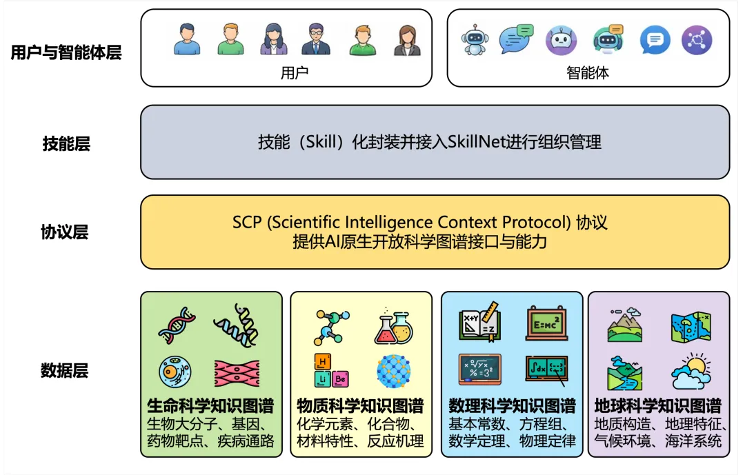 秉持上述核心理念,联合团队系统整理并汇集了生命、物质、数理及材料等八个细分学科的开源知识图谱,依托上海AI Lab推出的“科学智能上下文协议(SCP)”完成图谱的标准化封装,并在此基础上集成 SkillNet 实现服务的“技能化”跃迁,构建起AI原生的开放科学图谱服务(AI-Native Science Graph Open Service)。