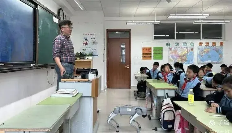 一只灵巧的四足机器狗在教室中央亮相,伴随着动感的音乐,它竟然开始翩翩起舞——摇头、摆尾、翻滚、跳跃,动作行云流水,引得孩子们笑声不断、掌声雷动。