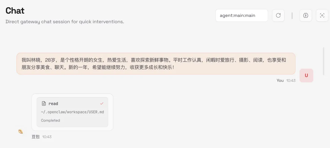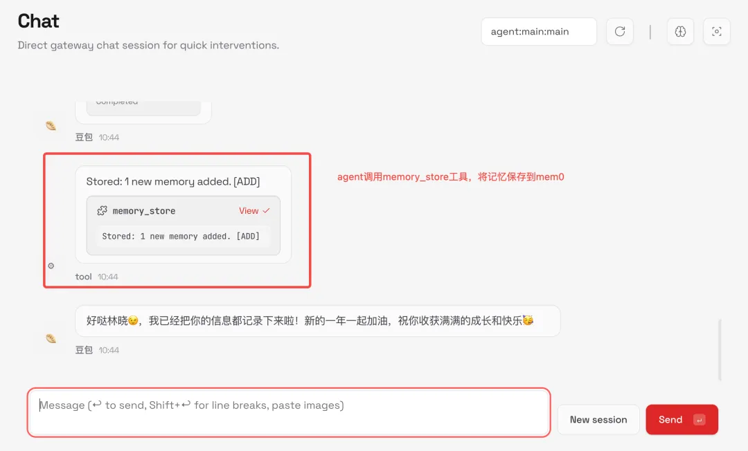 新开一个session,模拟输入带有很强用户信息的对话,验证OpenClaw是否触发记忆存储。