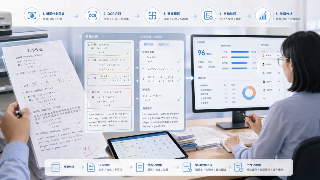 批改不再是终点,而是个性化学习的起点。在实际落地中,智能作业批改的完整链路已经跑通:学生拍照上传作业→AI自动批改→生成错题本→学情数据推送教师→支撑分层辅导。每一次批改都在积累结构化的学情数据,哪些知识点是高频错点、哪类错误最普遍,教师手里就有了从”经验型教学”转向”数据驱动型教学”的真实依据。