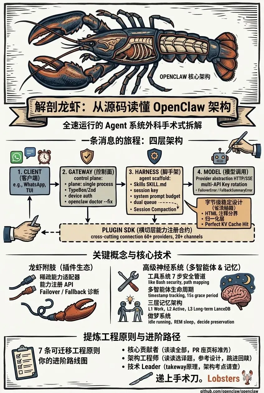 解剖一只龙虾,不是要把它拆坏,而是要在不破坏整体结构的前提下,把四层架构的每一层都翻开来看清楚。看完之后,你再见到一只活的龙虾,感受会完全不同。