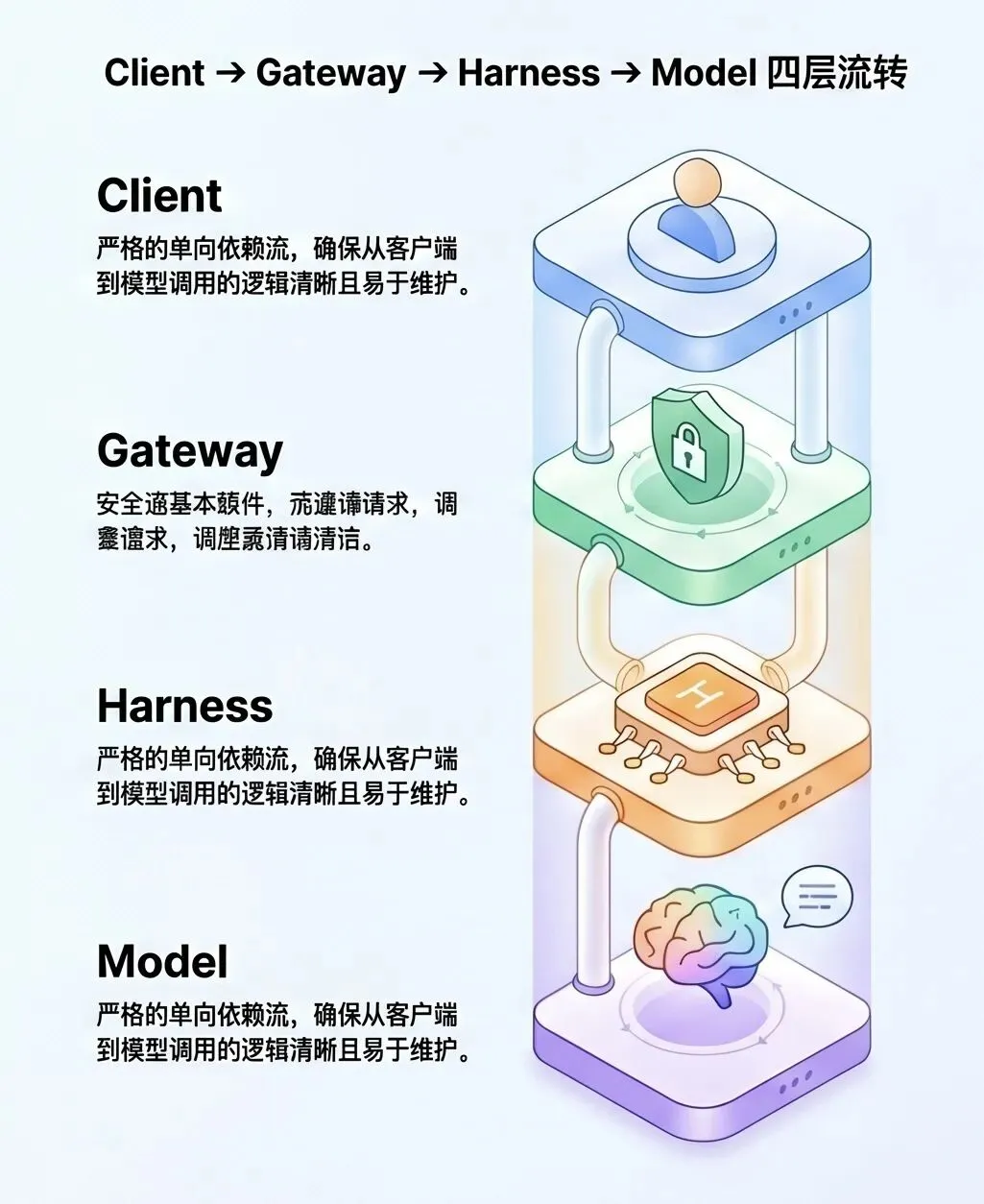 解剖的工具不是手术刀,而是源码。全书围绕 OpenClaw 2026.4.15版本源码,顺着四层架构(Client → Gateway → Harness → Model)逐层拆解。从流量入口到模型末梢,每一步都精准标注了源码路径(如src/gateway/server.ts:42),每一条设计决策皆有据可查。