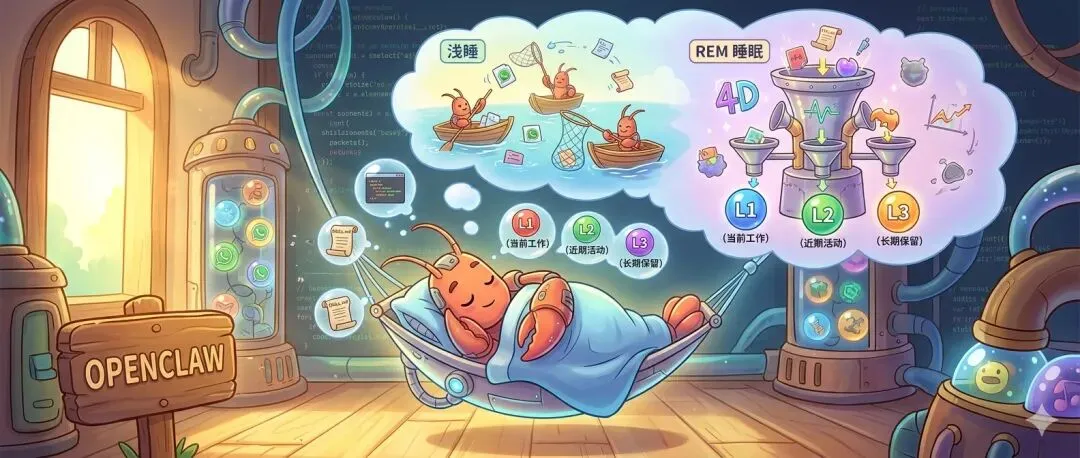 第 16 章是另一个亮点——三层记忆架构 + 梦境系统。L1 工作记忆(上下文窗口)→ L2 主动记忆(每日日志)→ L3 长期记忆(MEMORY.md + LanceDB 向量检索)。最有趣的是“做梦”机制:空闲时运行“浅睡”(消化日志)和“REM 睡眠”(用 4 维置信度公式决定哪些记忆值得长期保留)。