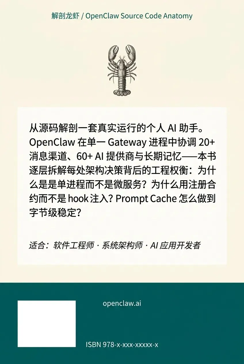 那么,继从 Claude Code 泄露的源码提炼出 Agent Harness 工程设计的核心原则后,我又用AI写了一本书——《解剖龙虾:深入 OpenClaw》,这就是你的必读指南。