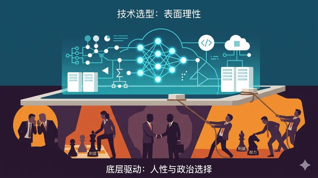 在真实的商业和组织系统中,任何技术选型(包括AI架构和框架选型)本质上都是受到底层的“人性选择”所驱动,而非纯粹理性的技术决定。